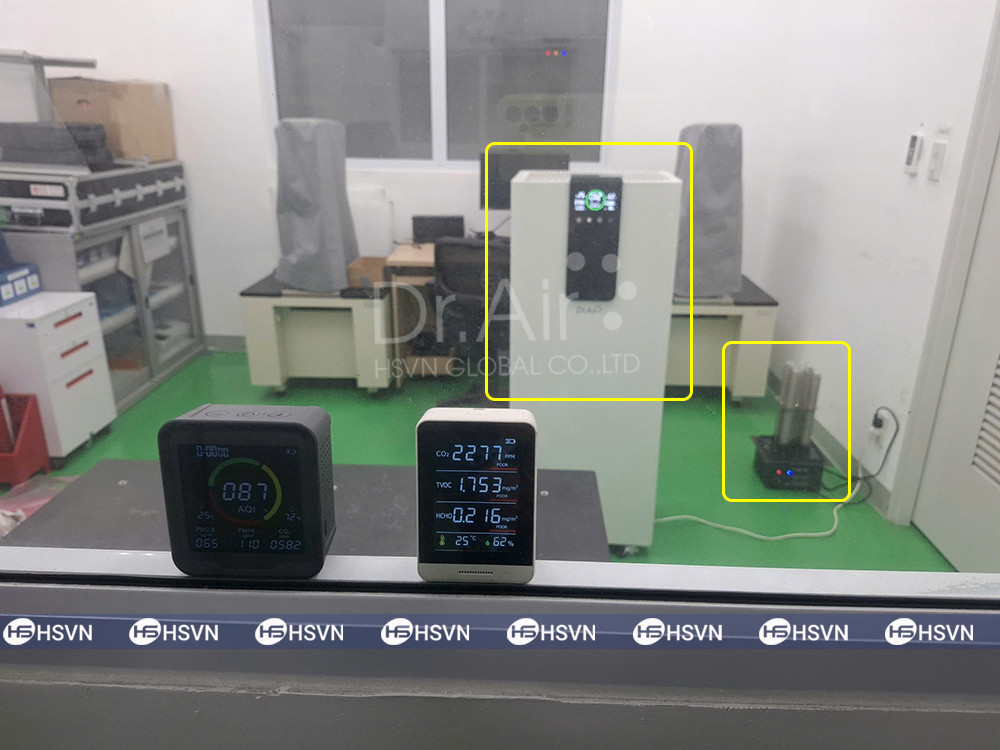 Nhân viên kỹ thuật cùng đại diện MHI Việt Nam tiến hành đóng kín phòng thí nghiệm. Sử dụng các nguồn phát để đưa nồng độ ô nhiễm lên mức báo động, chỉ số ban đầu CO2 vượt ngưỡng 5000 ppm, TVOC vượt ngưỡng 2000 mg/m3. Đây là mức ngưỡng máy có thể đo được, thực tế chỉ số còn vượt trên ngưỡng nhiều lần.