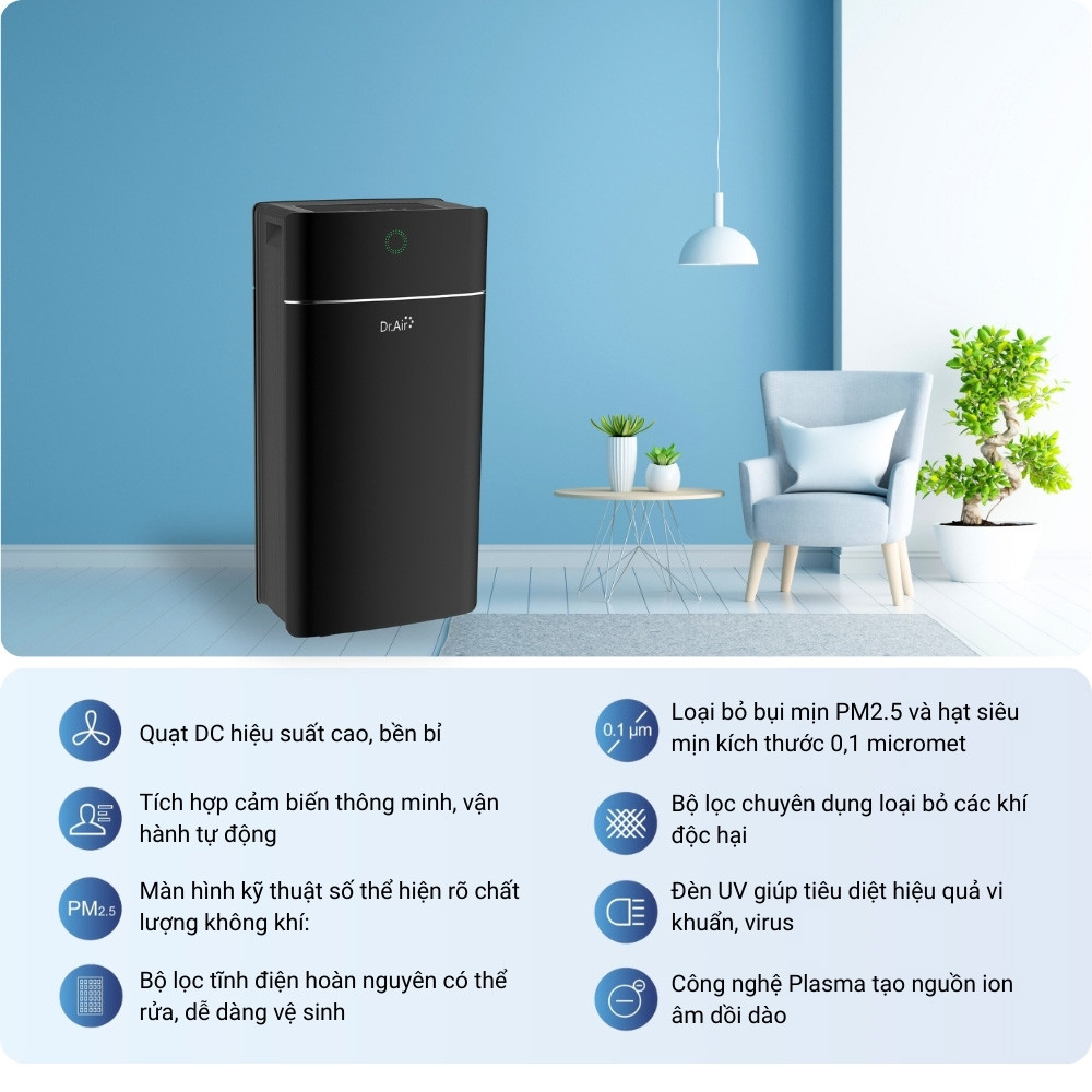 Với công suất lọc mạnh mẽ (CADR 460m³/h), vận hành êm ái và khả năng xử lý khói bụi vượt trội, Dr.Air EX Pro là giải pháp lý tưởng cho nhiều không gian (40-60m²):