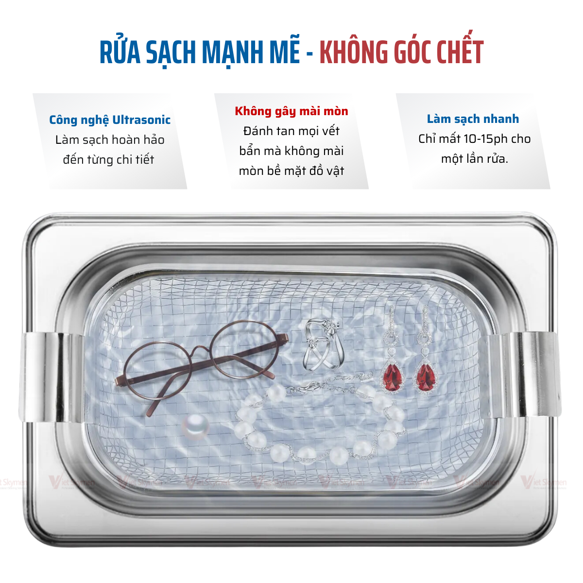 Điều này đặc biệt hữu ích với các vật dụng có hình dạng phức tạp như trang sức, đồng hồ, kính mắt, linh kiện kỹ thuật, bản mạch nhỏ, dụng cụ y tế, chi tiết cơ khí hoặc các phụ kiện có nhiều khe kẽ.