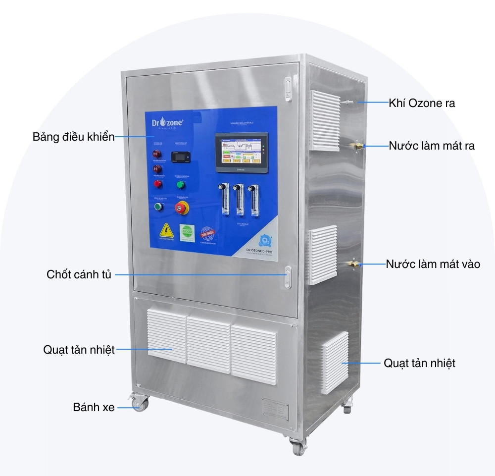 Dr.Ozone D-150 Pro sở hữu bảng điều khiển PLC hiện đại, tích hợp màn hình LCD hiển thị rõ ràng các thông số vận hành và nút bấm bố trí khoa học. Giao diện thân thiện giúp người dùng dễ dàng điều chỉnh công suất, cài đặt chế độ hoạt động và giám sát tình trạng máy. Hệ thống đèn báo thông minh cung cấp cảnh báo kịp thời về các sự cố như quá dòng, thiếu nước làm mát hay lưu lượng khí ozone thấp, đảm bảo an toàn và hiệu quả vận hành tối ưu.