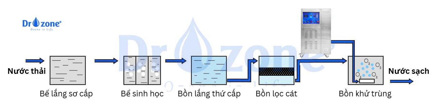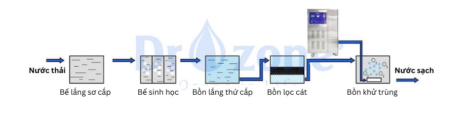 Mô hình dùng ozone xử lý nước thải ở trên, Ozone sử dụng trong giai đoạn thứ 5, sau khi nước thải được xử lý qua 4 giai đoạn lắng sơ cấp, xử lý sinh học hiếu khí, bồn lắng thứ cấp, bồn lọc cát.