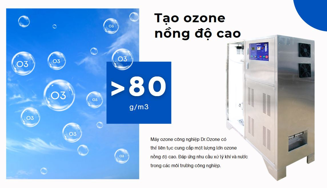 Máy ozone công nghiệp Dr.Ozone model D-200S hai phần chính : 1 máy tạo ozone (chỉ gồm bo mạch và buồng phóng), 01 hệ thống làm giàu Oxy bao gồm sấy lạnh, lọc không khí, tách nước. Dr.Ozone D-200s thường xử dụng trong quy trình xử lý nước thải, nước sinh hoạt, nước đóng chai, nước nuôi trồng thủy sản, hồ bơi hoặc xử lý khí thải ở quy mô lớn.